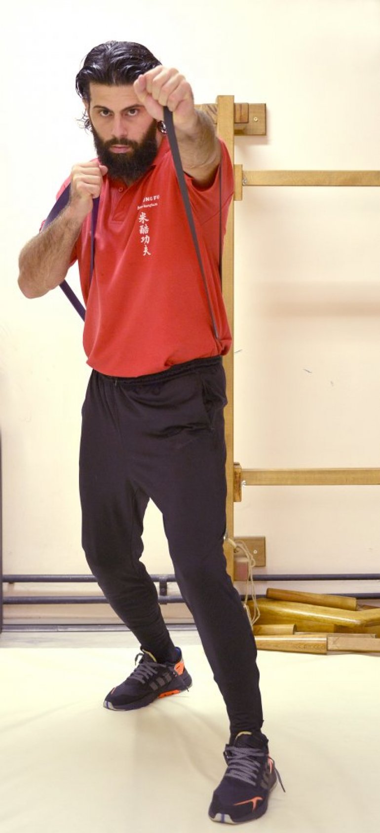 Stanete u položaj garda, leva ruka je napred, desna nazad, pa radite rotacije iz tela, dok vas sajla vuče pozadi. Usled angažovanja trbušnih mišića pod pritiskom, povlačenjem sajle morate da aktivirate noge i trup da biste ostali u balansu, a ruke su zapravo „nastavak“ onoga što radi trup.