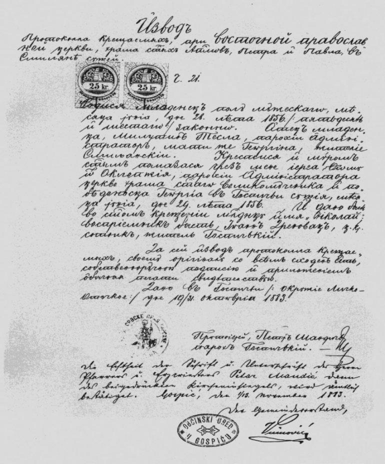 NIKOLA Tesla je rođen 28. juna 1856. godine po starom, 10. jula po novom kalendaru u Smiljanu, kao četvrto od petoro dece u porodici Tesla, u Vojnoj krajini Austrijskog carstva. Po mestu rođenja pripadao je Prvoj ličkoj regimenti - pukovniji i Medačkoj kompaniji - četi broj 9. Iako je u Smiljanu bila stacionirana 11. četa Prve ličke pukovnije, on je ipak upisan gde mu se otac rodio i gde je bio zaveden kao vojni obveznik, u Raduču, gde su živeli graničari Medačke čete. Roditelji su pored njega imali još tri ćerke - Angelinu, Milku i Maricu, i sina Danila.