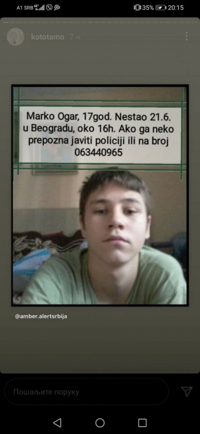 Markov tata moli sve koji vide njegovog sina da mu se jave na telefon 063440965 ili da kontaktiraju politiku.
