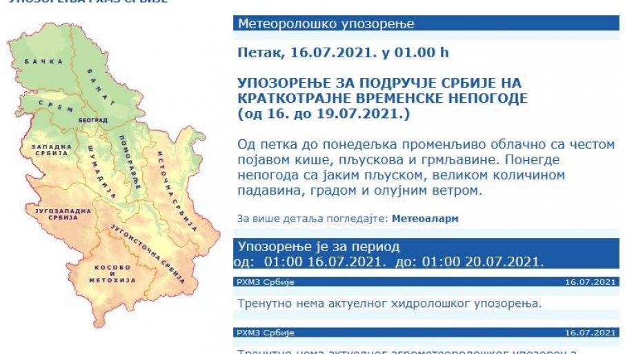 Upozorenje RHMZ na kratkotrajne vremenske nepogode od 16. do 19. jula