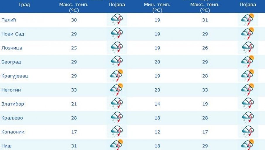 U Beogradu će biti povremeno oblačno, povremeno sa kišom, pljuskovima i grmljavinom, uglavnom po podne i uveče. Vetar slab i umeren, severni i severoistočni. Najniža temperatura 19, najviša 29 stepeni.