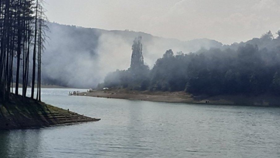 POŽAR koji je zahvatio nekoliko desetina ari na obali jezera Vrutci oko 15 časova, na delu obale Đokića livade, uznemirio je kupače i meštane.