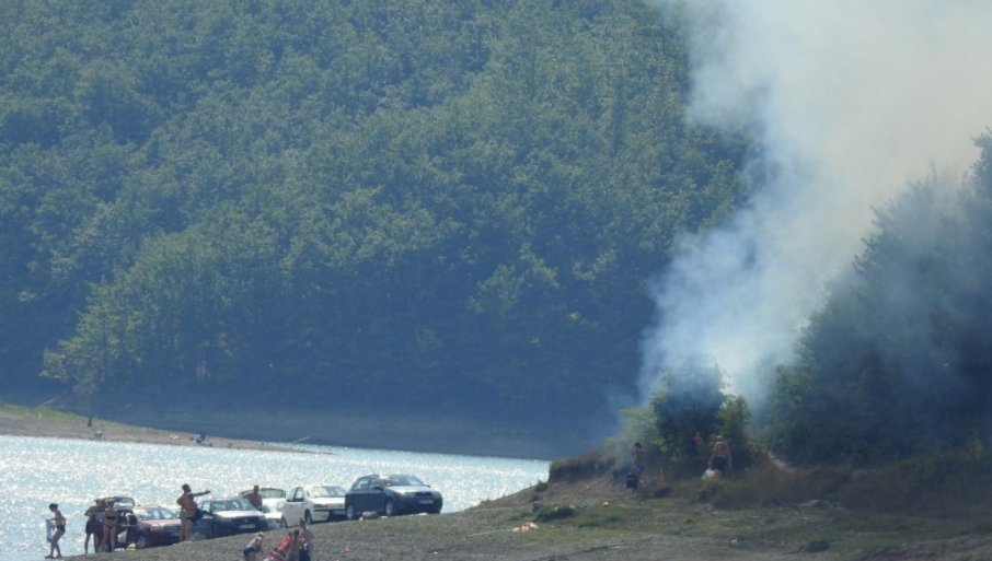 KUPAČI SKLONILI AUTOMOBILE UZ OBALU: Vatrogasci suzbijaju požar na jezeru Vrutci (FOTO)