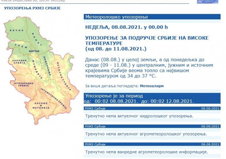 Na severu i zapadu zemlje biće malo svežije, ali će i dalje biti toplo sa temperaturama iznad prosečnih vrednosti, a u ostalim krajevima će se do srede zadržati veoma toplo, od 34 do 37 stepeni.