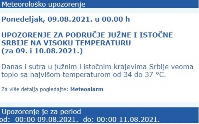 - I sutra i prekosutra u brdsko-planinskim predelima biće uslova za pojavu pljuskova lokalnog karaktera, ne tako intenzivnih i rasprostranjenih. U ostalim delovima zemlje suvo pretežno sunčano i toplo sa temperaturama od 30 do 35 stepeni. Tako da će se nastaviti period bez padavina - navodi.
