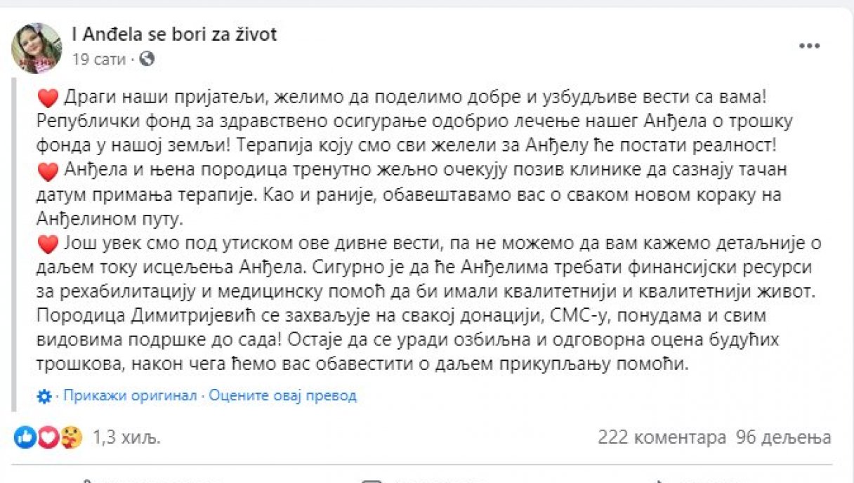 - Terapija koju smo svi priželjkivali za Anđelu će postati realnost! Anđela i njena porodica trenutno sa nestrpljenjem očekuju poziv sa klinike kako bi saznali tačan datum početka primanja terapije. Mi ćemo vas, kao i do sada, obaveštavati o svakom novom koraku na Anđelinom putu - navodi se na Fejsbuk stranici I Anđela se bori za život.
