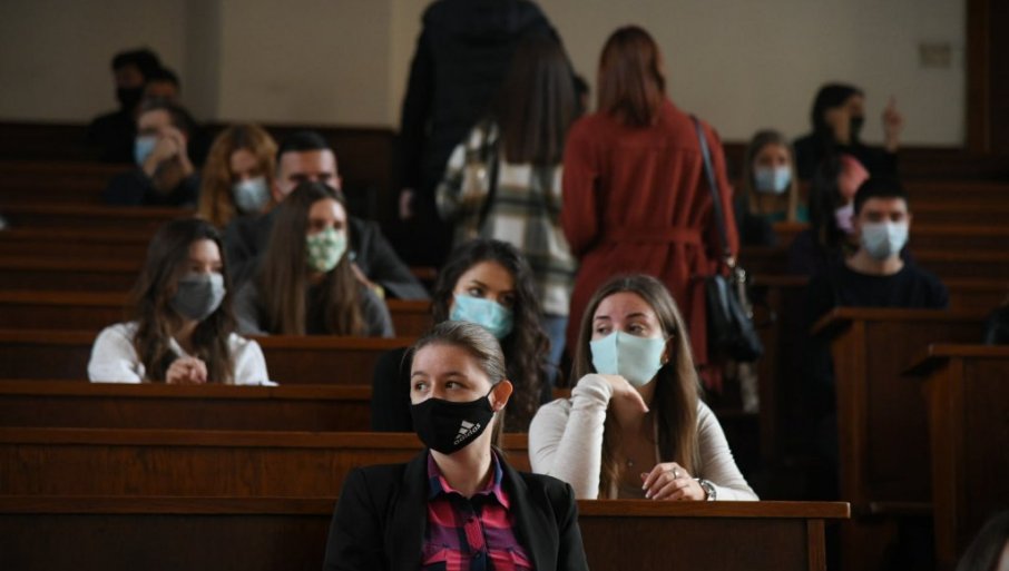 Prijem za brucoše, osim slušanja himni, obeležile su i mere zdravstvene zaštite, pa su fakulteti koje upisuje veliki broj studenata brucoše podelili u grupe.