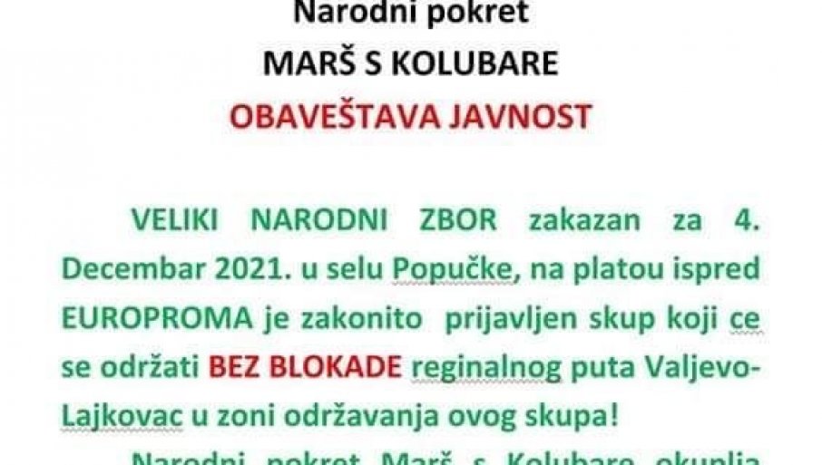 NARODNI pokret "Marš s Kolubare" obaveštava javnost da tokom skupa zakazanog za 4. decembar na platou ispred Europroma neće biti blokiran regionalni put Valjevo-Lajkovac u zoni održavanja skupa.