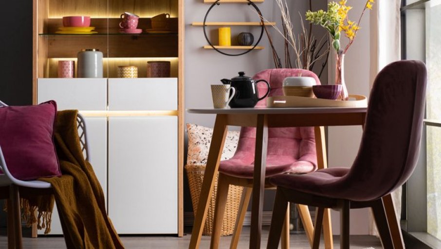 Za uređenje trpezarijskog ambijenta možete odabrati trpezarijski sto MAX S kao akcentni komad, a stolice koje možete kombinovati uz njega su trpezarijske stolice G603 u roze štofu sa drvenim nogarima i trpezarijsku stolicu PS-802 koja je istovremeno i funkcionalna i udobna. Stolice postavite sa 3 strane umesto na 4 strane, kako bi sto dobio asimetričnu notu.