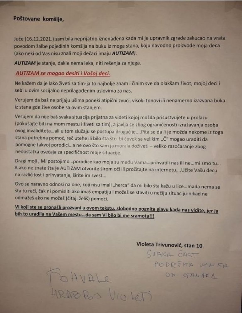 I s obzirom na to da, kako kaže, inače nisu bučni poput većine dece s autizmom, poseta upravnika zgrade dodatno ju je zatekla. Ova majka tada je rešila da komšijama ostavi poruku u ulazu zgrade.