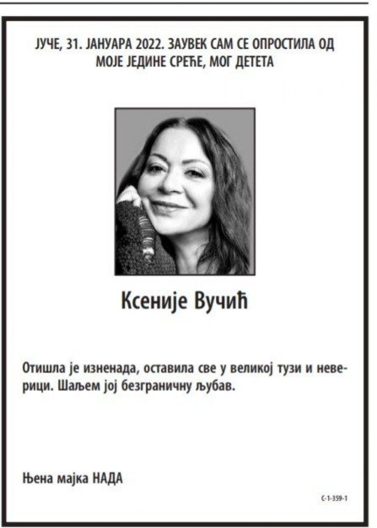 - Juče, 31. januara zauvek sam se oprostila od moje jedine sreće, mog deteta. Otišla je iznenada, ostavila sve u velikoj tuzi i neverici. Šaljem joj bezgraničnu ljubav - stoji u čitulji koju potpisuje Ksenijina majka Nada.