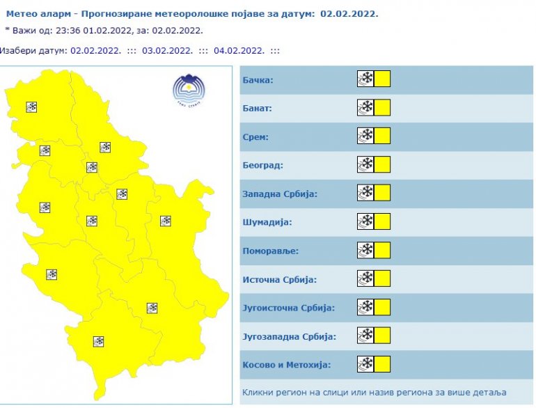 U naredna dva sata u Vojvodini i na jugoistoku zemlje mestimično slab sneg i susnežica. Zbog niske temperature tla na području cele zemlje lokalno će biti poledice.