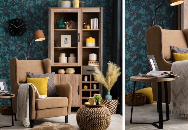 Fotelja ZURICH u mekanom svetlobraon štofu i pleteni tabure omekšaće rustičnost drvo dekora ostalih komada nameštaja, kao npr. klub stočića COBRA, ili vitrine NOTE. Upečatljiva vitrina NOTE svojim ravnim linijama predstavlja grandioznu i veličanstvenu fokusnu tačku u ambijentu, a pravi je izbor za enterijere sa zemljanom paletom boja, jer se lako uklapa sa bilo kojom akcentnom bojom.