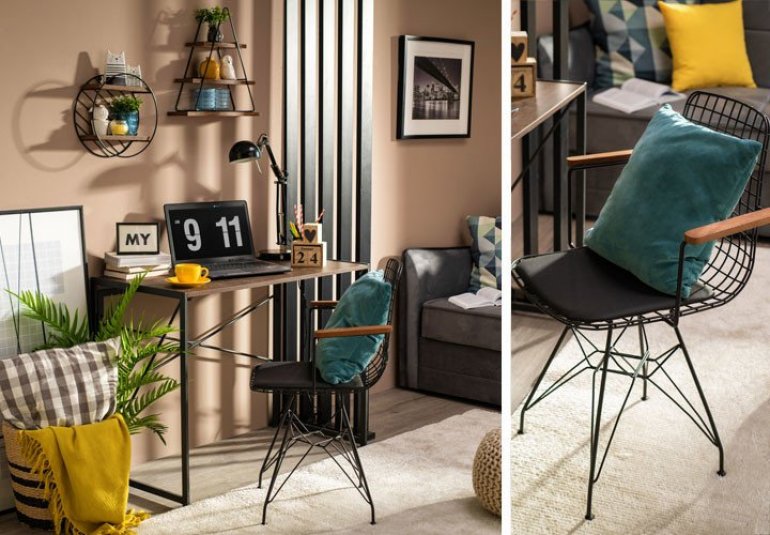 Radni kutak koji je deo dnevnog boravka možete pregraditi malim paravanom, pa tako boja zida prostor povezuje u celinu. Birajte nameštaj koji pripada industrijskom dizajnu i kombinacija je drvo dekora i metala. Sjajan primer je kompjuter sto CT- 1932, uz koji možete kombinovati moderno dizajniranu trpezarijsku stolicu VRP-001-K.