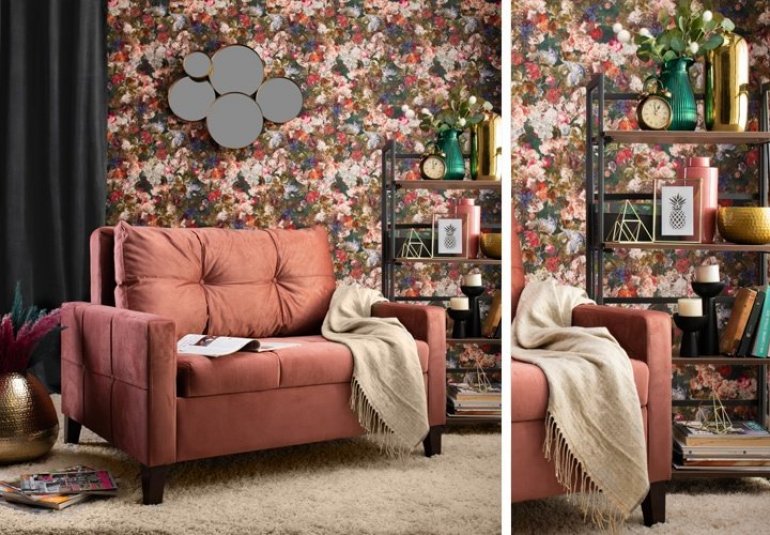 Prostor će još udobnijim i luksuznijim učiniti sjaj zlatne dekoracije i bogati tamni draper prozoru uz zid sa šarenim tapetama. Otvorena polica BS-1932 u dekoru drveta i metalne konstrukcije omogućava lak pristup omiljenoj knjizi ili mirišljavoj sveći, i odlično upotpunjuje prostor.