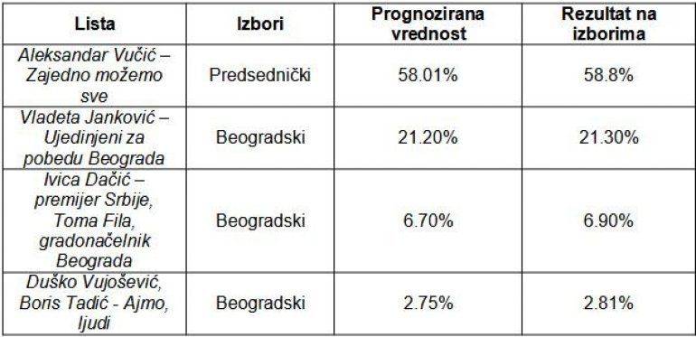 Ukupno odstupanje prognoziranih u odnosu na rezultate u nedelju uveče iznosi tek 1.15%