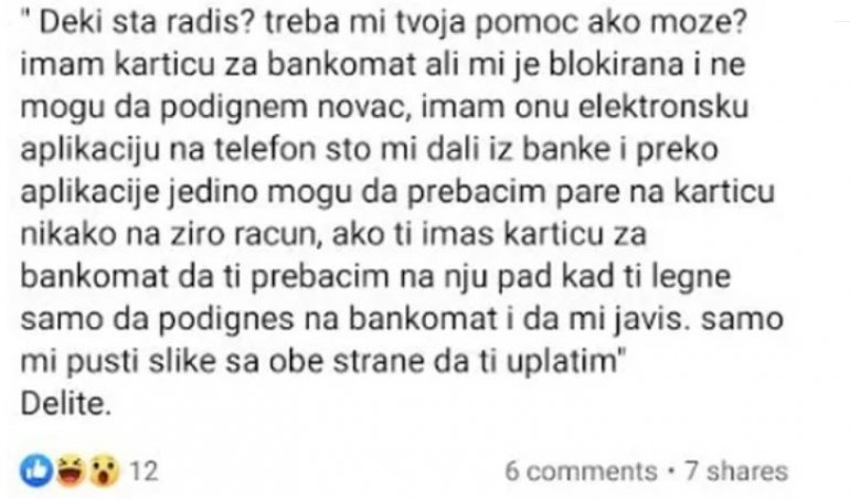 "Deki, šta radiš? Treba mi tvoja pomoć ako može? Imam karticu za bankomat ali mi je blokirana i ne mogu da podignem novac, imam onu elektronsku aplikaciju na telefon što su mi dali iz banke i preko aplikacije jedino mogu da prebacim pare na karticu nikako na žiro račun, ako ti imaš karticu za bankomat da ti prebacim na nju pa kad ti legne samo podigneš na bankomat i da mi javiš. samo mi pusti slike sa obe strane da ti uplatim."