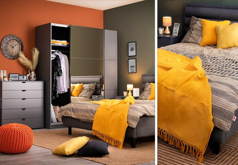 Žuta boja može biti zastupljena i u vašoj spavaćoj sobi. Uz zemljane boje zidova možete birati komade nameštaja u sivoj boji. Glavni komad u spavaćoj sobi može biti francuski ležaj LOZANA u sivom štofu, uz koji se sjajno uklapaju siva komoda DUERO 5F i garderober SIERRA 180 OG u istoj boji, koji ima i ogledalo.