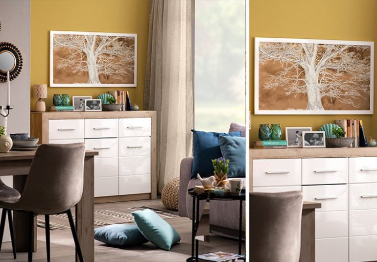 Ukoliko niste spremni da okrečite veliku površinu zida u žuto, možete se opredeliti za neki manji kutak koji će osvežiti ambijent. Komoda ETNA 3K3F u dekoru sivog hrasta veoma je praktičan izbor za ambijent, a savršeno bi se uklopilo da manji zid iza nje okrečite u zemljano zlatno žutu nijansu. Na zid možete da okačite sliku DRVO koja će uneti dašak prirode.