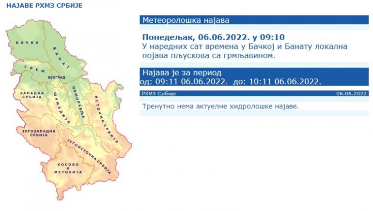 Podsetimo, RMHZ je izdao upozorenje za područje Srbije na kratkotrajne vremenske nepogode.