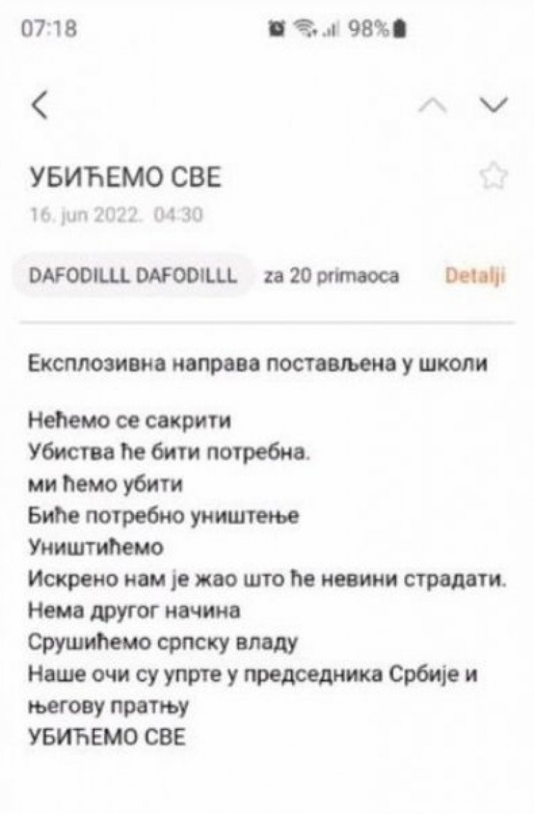 "UBIĆEMO SVE, PREDSEDNIKA SRBIJE I NJEGOVU PRATNJU" Ovako izgledaju jezive pretnje koje su jutros stigle na adrese osnovnih škola (FOTO)