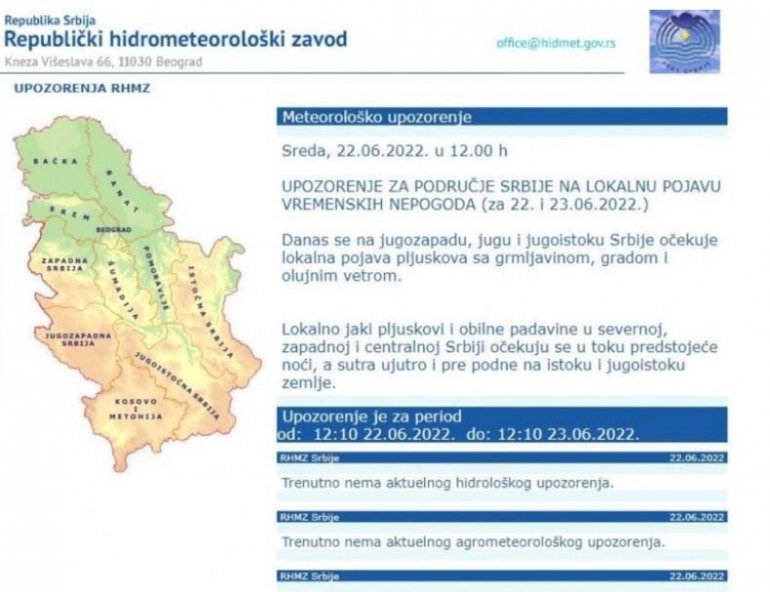 Podsetimo, meteorolozi su ranije već upozorili na moguće vremenske nepogode u većem delu Srbije večeras i tokom noći.