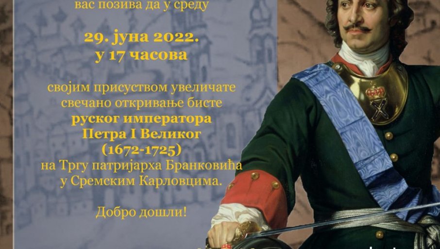 ISPRED Karlovačke bogoslovije u Sremskim Krlovcima, na Trgu patrijarha Brankovića, danas u 17 časova biće otkrivena spomen-bista ruskom caru Petru Velikom (1672-1725), a svečanosti će prisustvovati ruska delegacija na čelu sa savetnikom za kulturu predsednika Ruske Federacije Vladimirom Tolstojem, predsednik Pokrajinske vlade Igor Mirović, gradonačelnik Novog Sada Miloš Vučević, predsednik Opštine Sremski Karlovci Aleksabndar Stojkečić, Episkop sremski Vasilije, a među počasnim gostima biće i otpravnik poslova Ruske Federacije u Srbiji Andrej Temjašov.