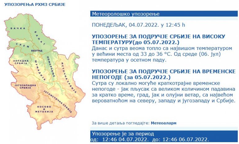- Sutra su lokalno moguće kratkotrajne vremenske nepogode - jak pljusak sa velikom količinom padavina za kratko vreme, grad, jak i olujni vetar, sa najvećom verovatnoćom na severu, zapadu i jugozapadu Srbije - stoji u upozorenju RHMZ-a.