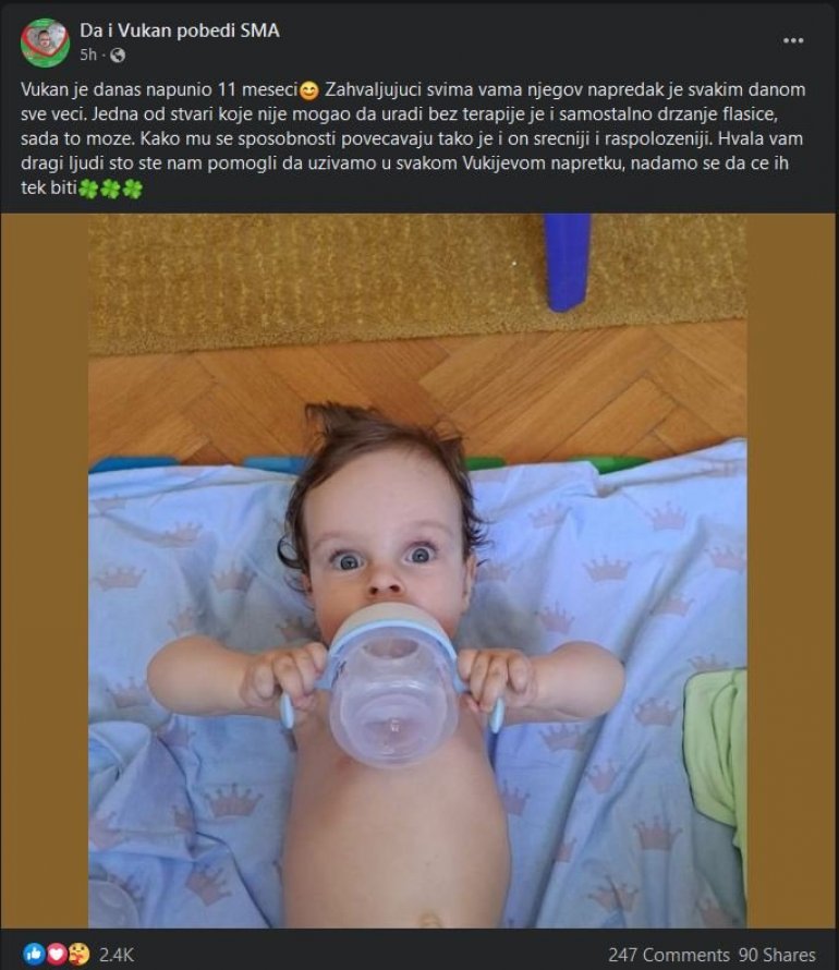 - Zahvaljujući svima vama njegov napredak je svakim danom sve veći. Jedna od stvari koje nije mogao da uradi bez terapije je i samostalno držanje flašice, sada to može. Kako mu se sposobnosti povećavaju tako je i on srećniji i raspoloženiji. Hvala vam dragi ljudi sto ste nam pomogli da uzivamo u svakom Vukijevom napretku, nadamo se da ce ih tek biti - navodi se na stranici "Da i Vukan pobedi SMA" – navodi se u objavi.