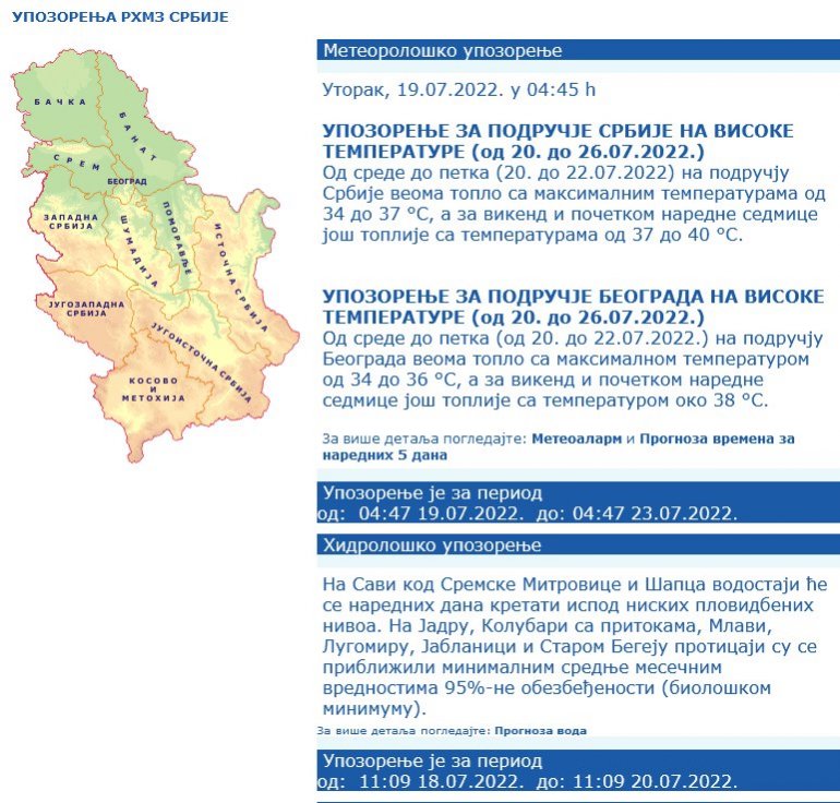 - Od srede do petka (20. do 22. 7. 2022) na području Srbije veoma toplo sa maksimalnim temperaturama od 34 do 37°C, a za vikend i početkom naredne sedmice još toplije sa temperaturama od 37 do 40°C - navodi se iz RHMZ-a.