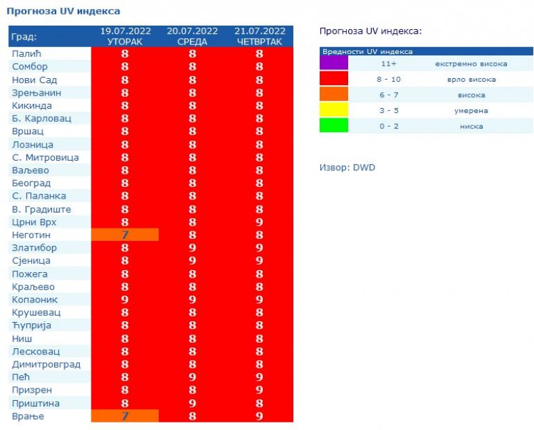 U većini mesta u Srbiji indeks UV zračenja biće u crvenoj zoni od 8 do 10 (vrlo visoko), dok će u Negotinu i Vranju ove vrednost biti 7 (visoko).