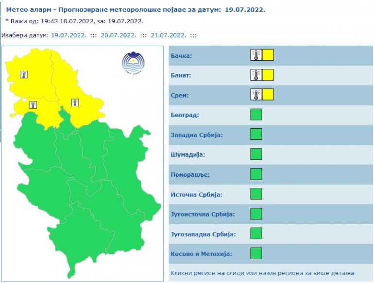 UPOZORENjE ZA PODRUČJE SRBIJE NA VISOKE TEMPERATURE (od 20. do 26. 7. 2022)