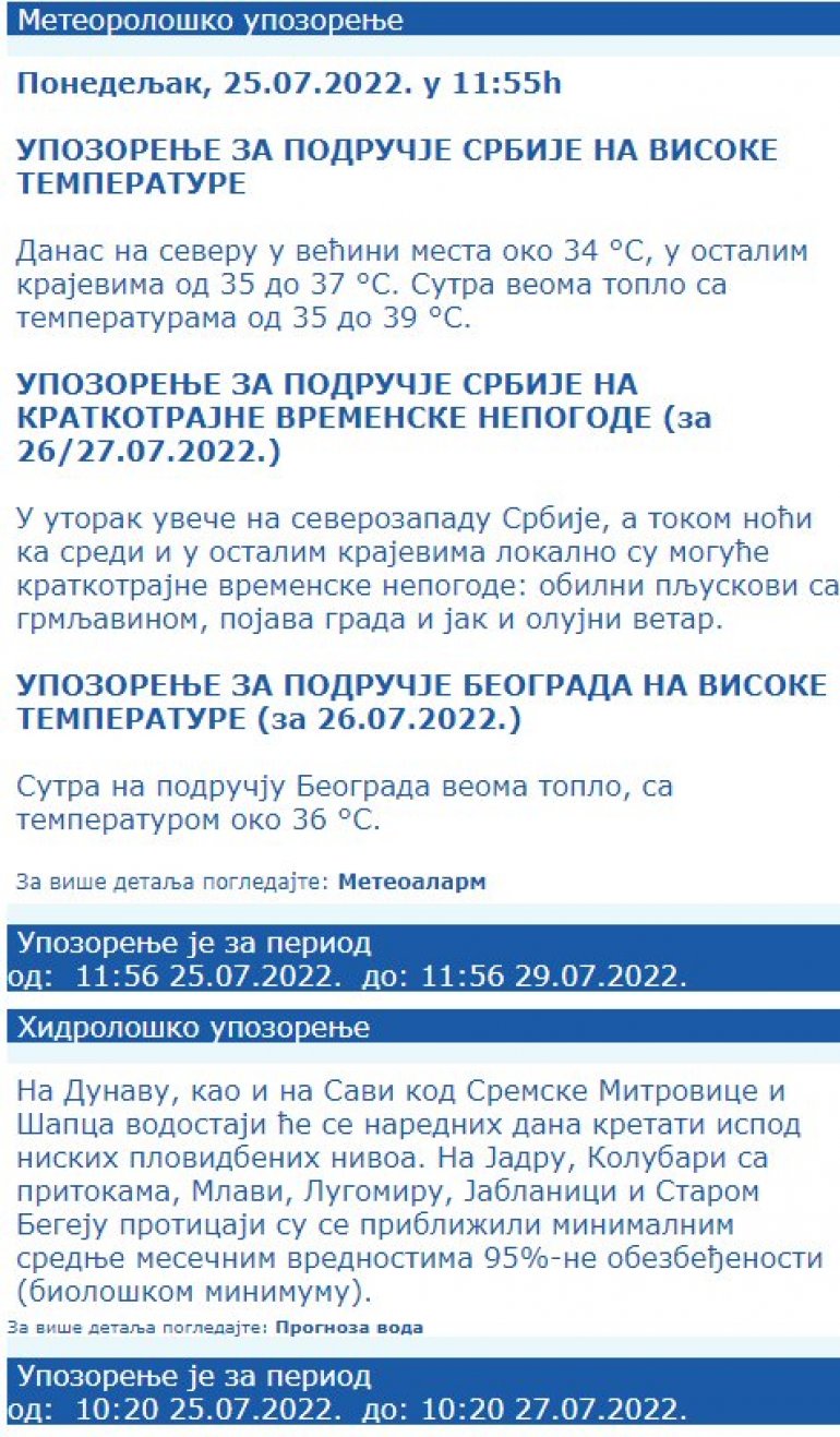 REPUBLIČKI hidrometeorološki zavod danas je izdao četiri upozorenja - hidrološko, dva na visoke temperature i na kratkotrajne vremenske nepogode.