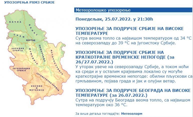 Na snazi je i upozorenje na kratkotrajne vremenske nepogode za 26. i 27. jul