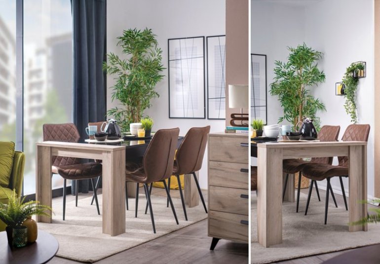 Trpezarijski sto TOLEDO, u kombinaciji sivog hrasta i crnog dekora, idealno će se uklopiti u svaku trpezariju zbog svog modernog dizajna. Zahvaljujući svojim dimenzijama, zadovoljava i potrebe mnogočlanih porodica. Njegova ploča delimično je izrađena od kaljenog stakla, što doprinosi eleganciji, a odlično se slaže uz trpezarijske stolice HTC-316, koje pružaju komfor i funkcionalnost i predstavljaju novi koncept u dizajnu trpezarijskih stolica. Odličan dodatak ambijentu biće i komoda UMBRIA 3K4F, koja se estetski slaže uz predložene komade nameštaja, a praktična je za odlaganje mnogih stvari. Gornju policu komode možete iskoristiti za dodatnu dekoraciju.