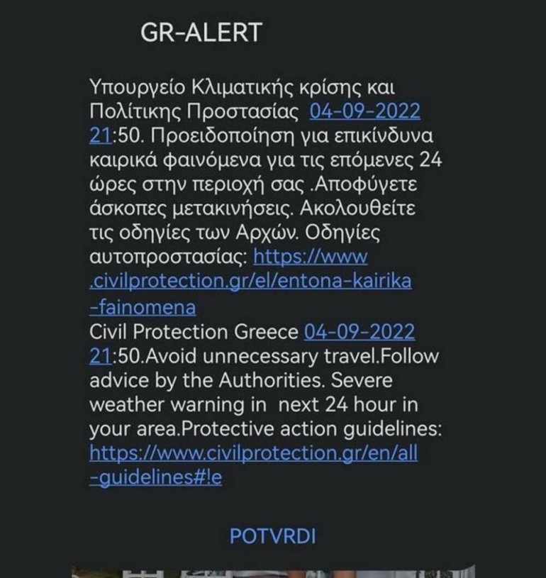 - U poruci piše da će u sledećih 24 sata verovatno biti nevreme i da bez razloga ne idete daleko od kuće automobilom. Centralna Grčka i Solun su isto dobili obaveštenje - navodi jedna korisnica.