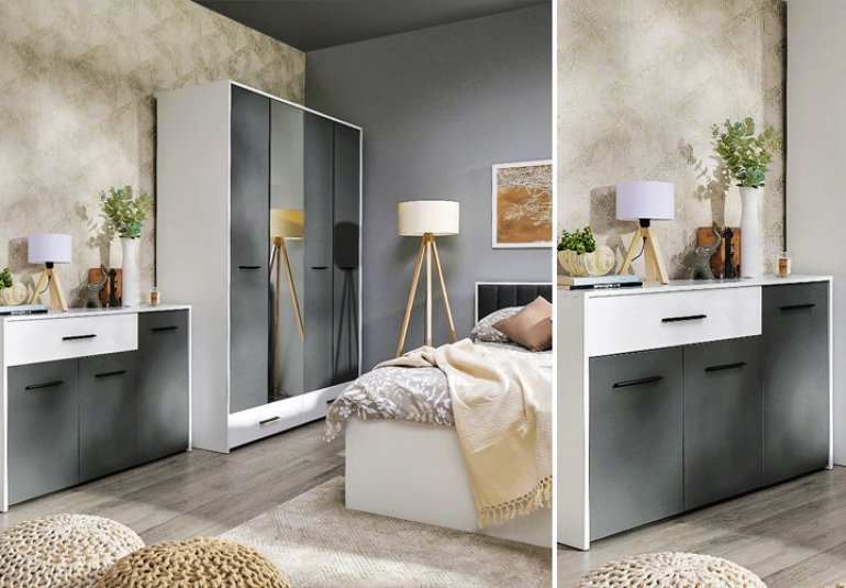 Slična kombinacija boja i dekora, gde su kombinovani beli i grafit sivi dekor, primenjena je u sobi VARADERO sa bračnim krevetom VARADERO 160. Uz ovaj ambijent savršeno idu i ormar VARADERO 4K2F1O, kao i komoda VARADERO 3K1F, a noćni ormarić VARADERO NO2F postavite pored kreveta, da vam sve sitnice budu pri ruci. Kao dekoraciju možete postaviti slike, tepihe i dodatne elemente u sličnim tonovima, a možete se odlučiti i za toplije tonove, ukoliko želite bar malo da utoplite odabranu hladnu notu monohromatskog stila.