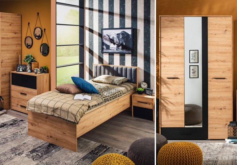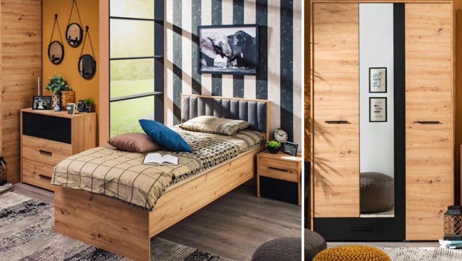Za sve ljubitelje toplijih tonova, takođe postoji rešenje u okviru kolekcije spavaćih soba VARADERO. Elementi VARADERO izrađeni u kombinaciji dekora artisan hrasta i crne, uz crne ručice na frontovima i crna tapacirana uzglavlja na krevetima, posebno su privlačni za ljubitelje tople rustike, a što je još jedan primer kontrasta za naglašavanje enterijera.