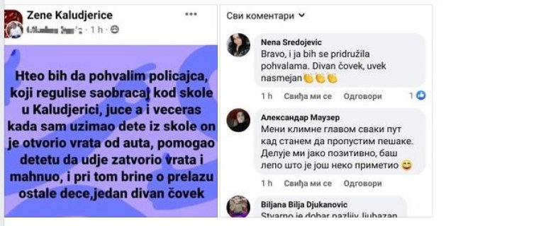 Na grupi "Žene Kaluđerice", jedan korisnik Fejsbuka objavio je pohvale na rad ovog policijskog službenika iz Grocke, a nakon toga usledili su brojni lepi komentari njegovih sugrađana.