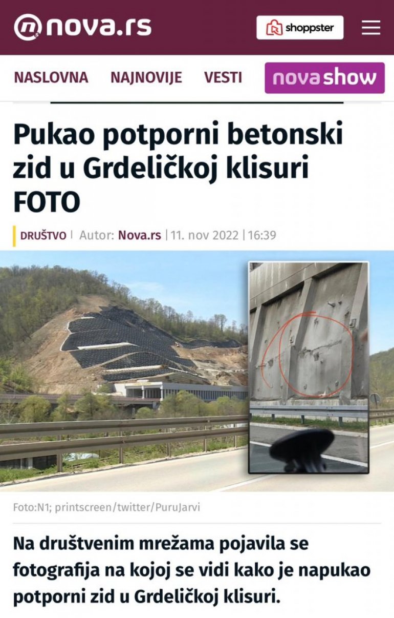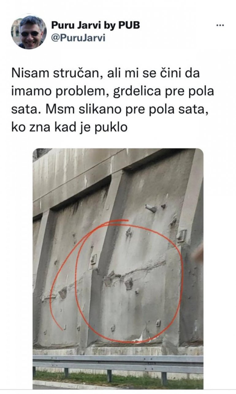 - Naša kompanija prati sve objave koje se tiču puteva i čim smo u toku dana videli objavu sa profila pod pseudonimom, poslata je dežurna ekipa inženjera na trasu autoputa. Oni su ustanovili da nikakve pukotine na potpornim zidovima u Grdelici ne postoje i da su sve kosine potpuno stabilne. Slika, koja se pojavila, pokazuje mesto na kome je izvršen prekid betoniranja tokom same izgradnje, takvo je stanje od kako je stabilizacija kosine završena i ništa se nije menjalo u proteklom periodu - navodi se u saoštenju.