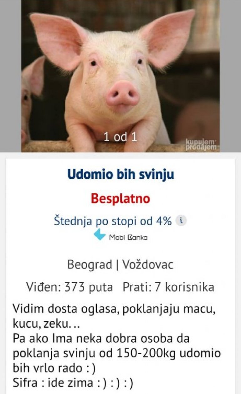 Na sajtu namenjenom za kupovinu i prodaju, pojavio se neobičan oglas koji je nasmejao Srbiju. Beograđanin Igor oglasio je da želi da udomi svinju.