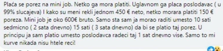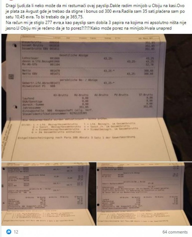 - Na račun mi je stiglo 277 evra, a kao pejslip sam dobila 3 papira na kojima mi apsolutno ništa nije jasno. U Obiju mi je rečeno da je to porez?! Kako može porez na minidžob. Hvala unapred - postavila je pitanje u jednoj od Fejsbuk grupa koje okupljaju naše ljude koji već decenijama žive i rade u Nemačkoj.