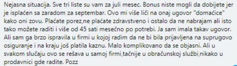 - Dragi ljudi,da li neko može da mi rastumači ovaj pejslip. Dakle radim minidžob u Obiju na kasi. Ovo je plata za avgust gde je trebalo da stigne i bonus od 300 evra. Radila sam 35 sati, plaćena sam po satu 10,45 evra. To bi trebalo da je 365,75..., napisala je ona i dodala: