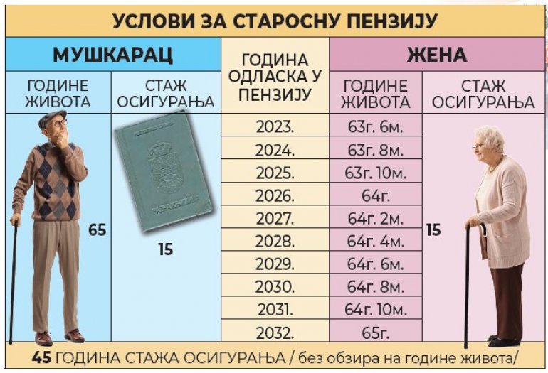 Zakon propisuje pomeranje starosnog uslova za žene sve do 2032. kada će oba pola biti izjednačena, 65 godina života i najmanje 15 osiguranja.