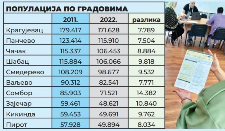 Među gradovima koji su izgubili više od 10 odsto populacije, što je republički prosek su: Požarevac (za 18.202 manje), Subotica (za 16.875 manje), Zrenjanin (za 16.800 manje), Vranje (za 16.274 manje), Kruševac (za 14.421 manje), Kraljevo (za 13.997 manje) i Užice (za 14.338 manje).