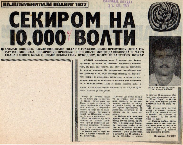 - Najpre sam polako podvukao veliki, debeli, drveni kolac ispod debele žice, u neposrednoj blizini gvozdenog stuba, a zatim sam prvi put oštricom sekire udario snažno po užetu. Sećam se da mi je posle tog udarca struja izbacila sekiru iz ruke. Uzeo sam je ponovo i udario još četiri puta. Tek sam, dakle, iz petog pokušaja presekao uže dalekovoda, inače dugo oko četrdeset metara, i uspeo da ga izolujem. Rastavio sam tu užarenu masu i polako je konopcem zabacio iza reke. Isto sam uradio i na drugom kraju. Evo, ni dan-danas ne mogu da shvatim kako mi struja nije spalila telo, kako me nije ubila - kaže nam junak ove neverovatne priče.