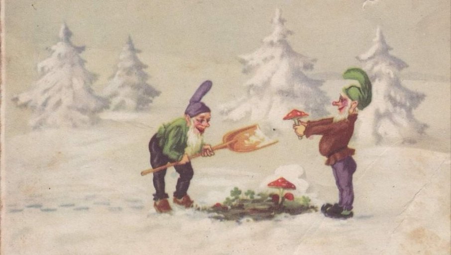 Sa prednje strane razglednice, koja predstavlja čestitku Božića i predstojeće Nove godine, oslikani su patuljci u snegu sa pečurkama. Na poleđini je tekst čestitke koji prenosimo u celini: