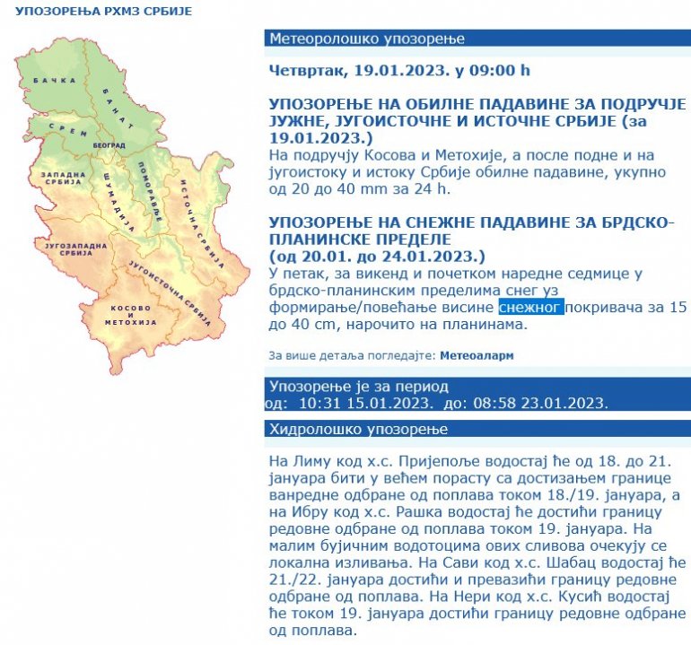 - Na Limu kod h. s. Prijepolje vodostaj će od 18. do 21. januara biti u većem porastu sa dostizanjem granice vanredne odbrane od poplava tokom 18/19. januara, a na Ibru kod h. s. Raška vodostaj će dostići granicu redovne odbrane od poplava tokom 19. januara. Na malim bujičnim vodotocima ovih slivova očekuju se lokalna izlivanja. Na Savi kod h. s. Šabac vodostaj će 21/22. januara dostići i prevazići granicu redovne odbrane od poplava. Na Neri kod h. s. Kusić vodostaj će tokom 19. januara dostići granicu redovne odbrane od poplava.