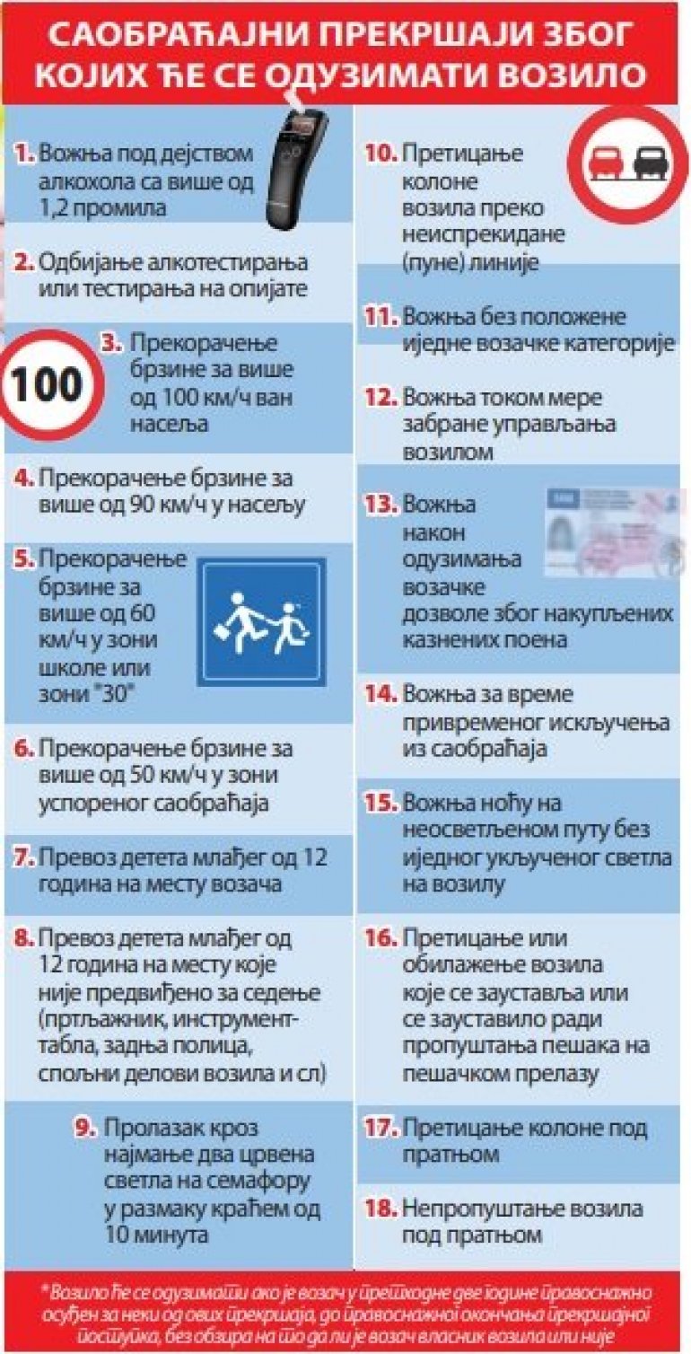 VOŽNjA pod dejstvom alkohola sa više od 1,2 promila u krvi, odbijanje alko-testa, vožnja bez vozačke dozvole ili tokom mere zabrane upravljanja vozilom - samo su neki sa spiska od 18 saobraćajnih prekršaja zbog kojih će se oduzimati vozilo, prema predloženim izmenama Zakona o bezbednosti saobraćaja na putevima.