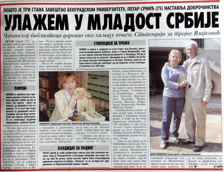 SVI mi umiremo samo jednom, a veliki ljudi dva puta: jednom kada ih nestane sa zemlje, a drugi put kad propadne njihova zadužbina, napisao je u romanu "Na Drini ćuprija" naš nobelovac Ivo Andrić. Veliki dobrotvor Petar Srnić (1934-2023) preminuo je 11. januara ove godine u Beogradu, ali je njegov zadužbinarski duh nastavio da živi. Sve što je stvarao i stekao za gotovo šest decenija rada, ostavio je mladim naraštajima.